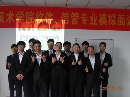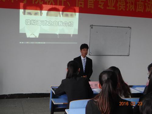 随着信息技术学院2016年实习就业活动紧锣密鼓地展开,3月23日,信息技术学院在创业楼412教室成功举办2014级“求职达人之自我介绍”活动。信息技术学院软件技术、信息管理专业12名学生参加了现场模拟面试表演,信息技术学院相关负责人及专业负责人担任模拟“面试官”。