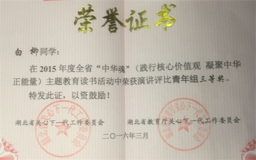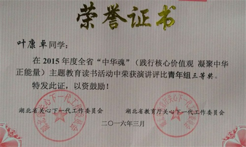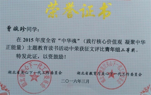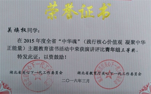 在2015年度湖北省“中华魂”(践行核心价值观 凝聚中华正能量)主题教育活动中,护理学院曾婉珍、刘甜两位同学分别荣获征文比赛青年组二等奖、三等奖,信息技术学院叶康卓、护理学院关焕权、美容学院白柳三位同学分别荣获演讲比赛青年组三等奖。